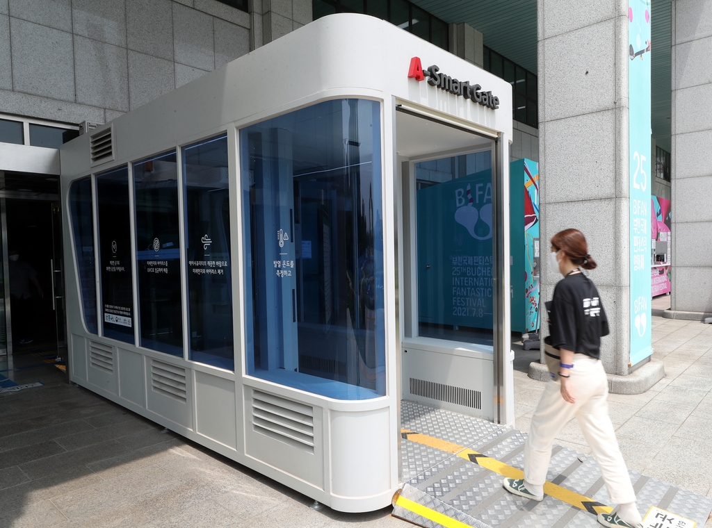 | ▲ 부천시청사에 설치된 스마트 게이트 (부천=연합뉴스) 윤태현 기자 = 제25회 부천국제판타스틱영화제 개막 나흘째인 지난 12일 영화제 상영관이 있는 경기도 부천시 중동 부천시청사 출입문에 '스마트 게이트'(Smart Gate)가 가동되고 있다. 스마트 게이트는 통로형 공기청정기기로 바람을 일으켜 옷 등에 붙어있는 초미세먼지를 빨아들이는 식으로 구동된다. 2021.7.14 tomatoyoon@yna.co.kr (끝) |