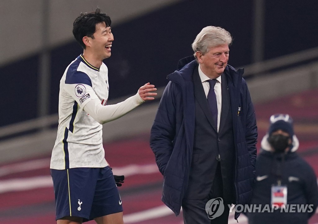 | ▲ In this Reuters photo, Son Heung-min of Tottenham Hotspur (L) shares a laugh with Crystal Palace's head coach Roy Hodgson during a Premier League match against Crystal Palace at Tottenham Hotspur Stadium in London on March 7, 2021. (Yonhap) |