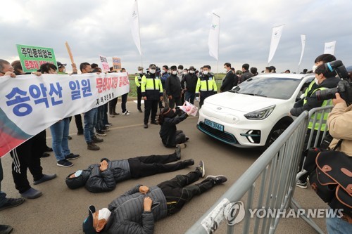| ▲ 제주 드론 택시 시연 행사 '파행' (서귀포=연합뉴스) 박지호 기자 = 21일 오후 서귀포시 대정읍 섯알오름 주차장에서는 열린 '제주 드론 비전 선포식' 후 제주도의 송악산 문화재 지정 방침에 반대하는 하모리 일대 주민 20여명이 원희룡 제주지사가 탑승한 차량을 가로막고 면담을 요구하고 있다. 2020.11.21 jihopark@yna.co.kr |