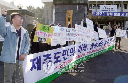 | ▲ 제주국제자유도시 반대 시위 (제주=연합뉴스) 2001년 11월 20일 제주지역 사회단체로 구성된 국제자유도시 추진 반대를 위한 공동대책위원회 회원들이 제주도청 입구에서 "도민 의견 수렴 없는 국제자유도시 추진 반대"를 외치며 시위를 벌이고 있다. [연합뉴스 자료사진] |