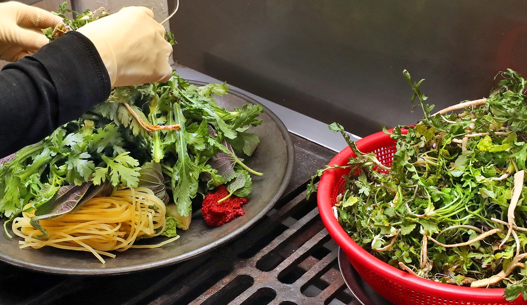 | ▲ 물닭갈비에 들어가는 야채는 파, 배추, 쑥갓, 깻잎, 부추 등 5가지다. 겨울에는 냉이가 추가된다. [사진/조보희 기자] |