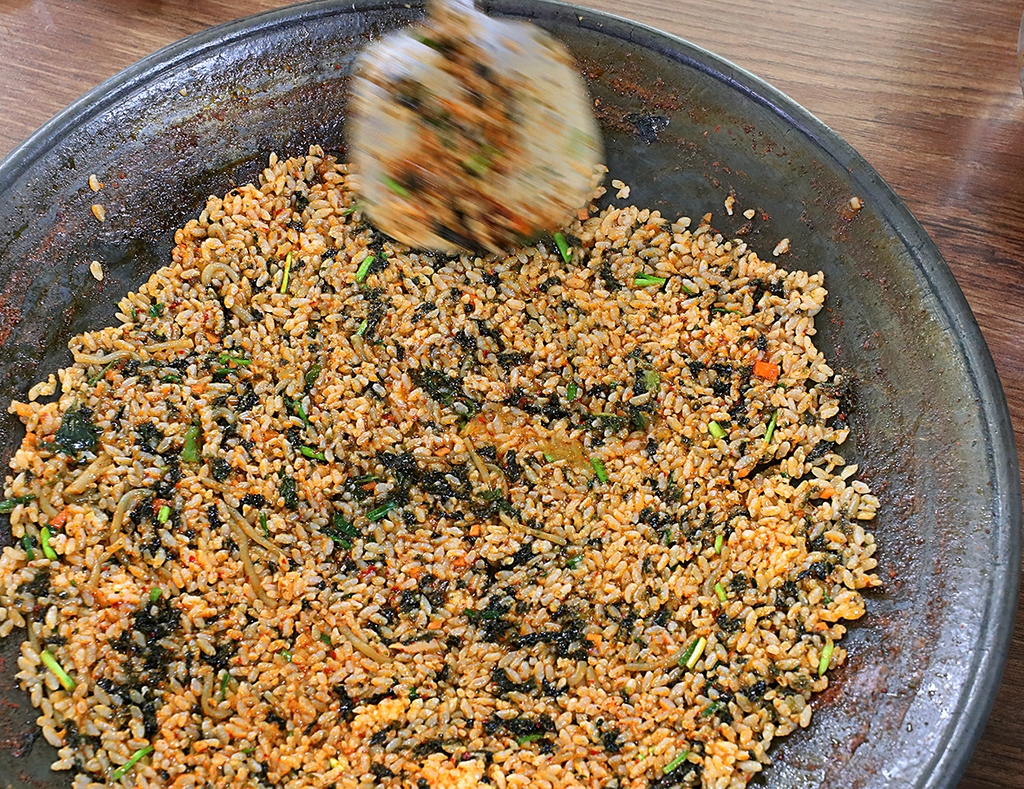 그렇지만 여기가 끝이 아니다. 볶음밥이 남아 있다. 물닭갈비 국물에 볶아 먹는 밥은 빼놓을 수 없는 별미라고 한다. 닭고기, 야채, 사리의 맛이 깊이 우러난 국물에 밥을 볶으니 그럴 수밖에 없다.