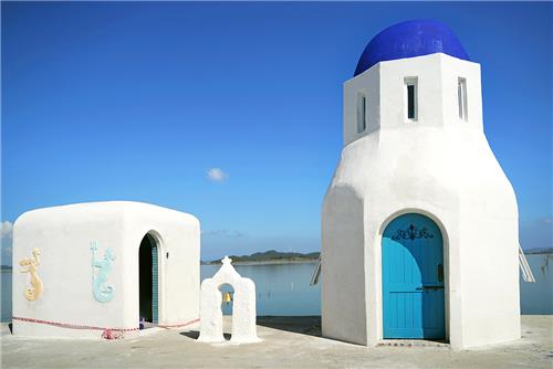 | ▲ 건강의 집, 베드로'는 대기점도 선착장에 내리자마자 만나게 된다. 그리스 산토리니섬을 연상시키는 블루와 화이트 컬러의 아름다운 예배당이며, 미술가 김윤환이 디자인했다. [신안군 제공] |