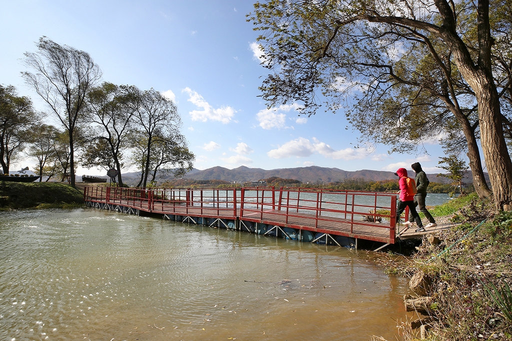 길은 양강섬으로 이어진다. 섬은 길이 약 100m의 뜬다리로 연결돼 있었다. 이 부교는 지난해 9월 공사를 시작해 올해 7월 완공됐다.