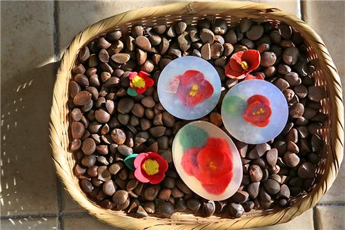 | ▲ 바구니에 담긴 애기동백 열매와 동백기름으로 만든 비누 [사진/전수영 기자] |