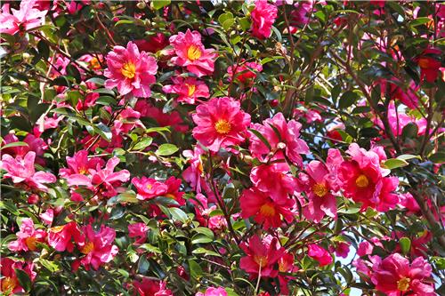 | ▲ 애기동백은 여러 장의 꽃잎을 활짝 펼친 채 나무를 진분홍빛으로 뒤덮는다. [사진/전수영 기자] |