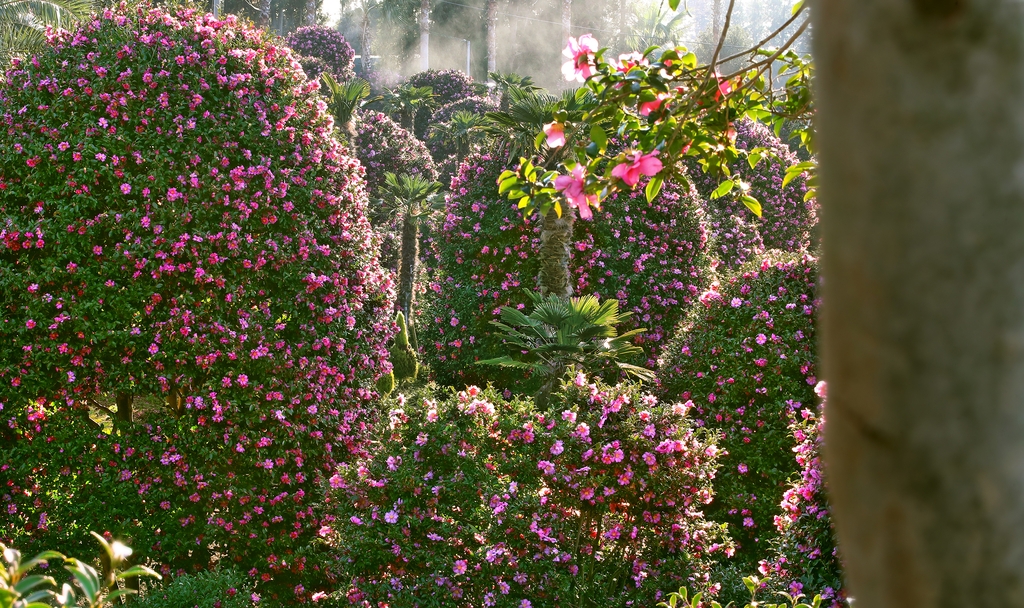 이른 아침 찾은 수목원의 풍경은 마치 동화 속 한 장면 같았다. 거대한 솜사탕처럼 둥글게 다듬은 애기동백 나무들이 진분홍빛 꽃을 단 채 빽빽하게 늘어서 있었다. 한 그루 한 그루가 마치 거대한 꽃다발 같기도 하다.