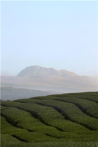| ▲ 초록빛 차밭 능선 너머로 어슴푸레 모습을 드러낸 한라산 [사진/전수영 기자] |