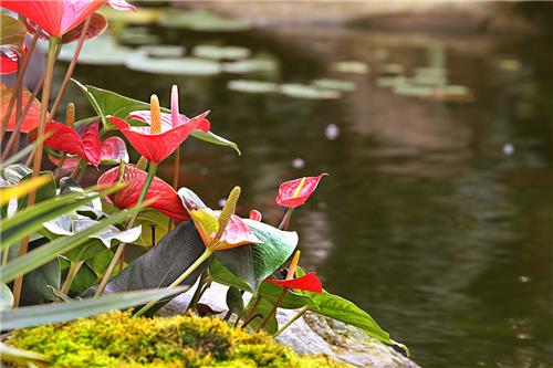| ▲ 지중해온실 내 연못가에 활짝 핀 안수리움(홍학꽃) [사진/전수영 기자] |
