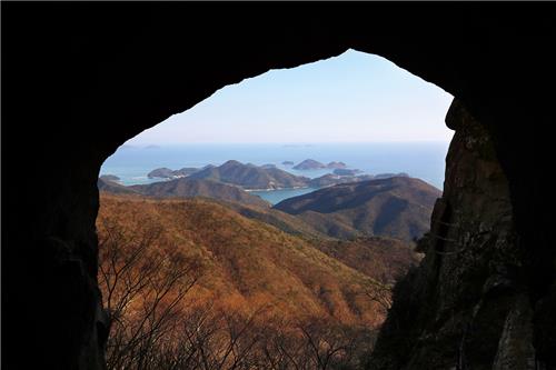 동굴처럼 생긴 쌍홍문 안으로 들어가 뒤를 돌아보니 둥근 원 안으로 보이는 다도해의 풍광이 일품이다.
