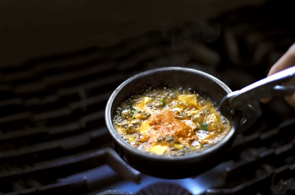 멸치로 맛을 낸 국물에 파 뿌리와 청양고추, 양파, 무, 고춧가루, 호박, 두부 등 갖가지 재료가 조화를 이룬다.