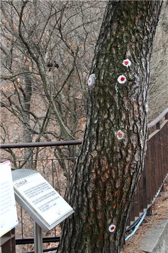 | ▲ 1968년 1·21 사건 때 발생한 교전으로 인한 총탄 흔적이 표시된 소나무 [사진/전수영 기자] |