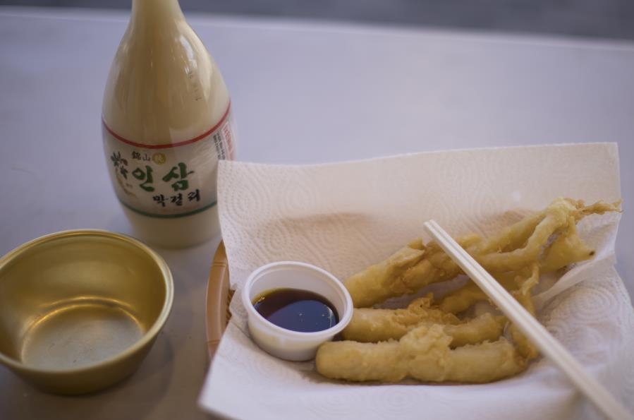 | ▲  독특한 맛의 인삼 튀김과 인삼막걸리 [사진/성연재 기자] |