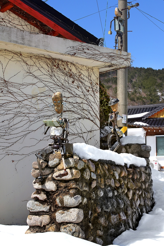 | ▲ 돌담을 장식한 이 조형물은 녹슨 고철과 폐품을 이어 만들었다. [사진/전수영 기자] |