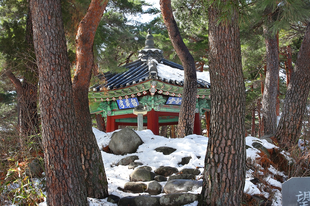 속초도문농요전수관 앞 주차장에 차를 세우니 소나무 숲이 우거진 야트막한 언덕 위에 조그만 정자 하나가 눈길을 끈다. 정자에 오르니 붉은빛을 띤 금강송들이 구불구불 학이 춤추는 듯한 형상이다. 그래서 학무정이라 이름 붙였나보다.