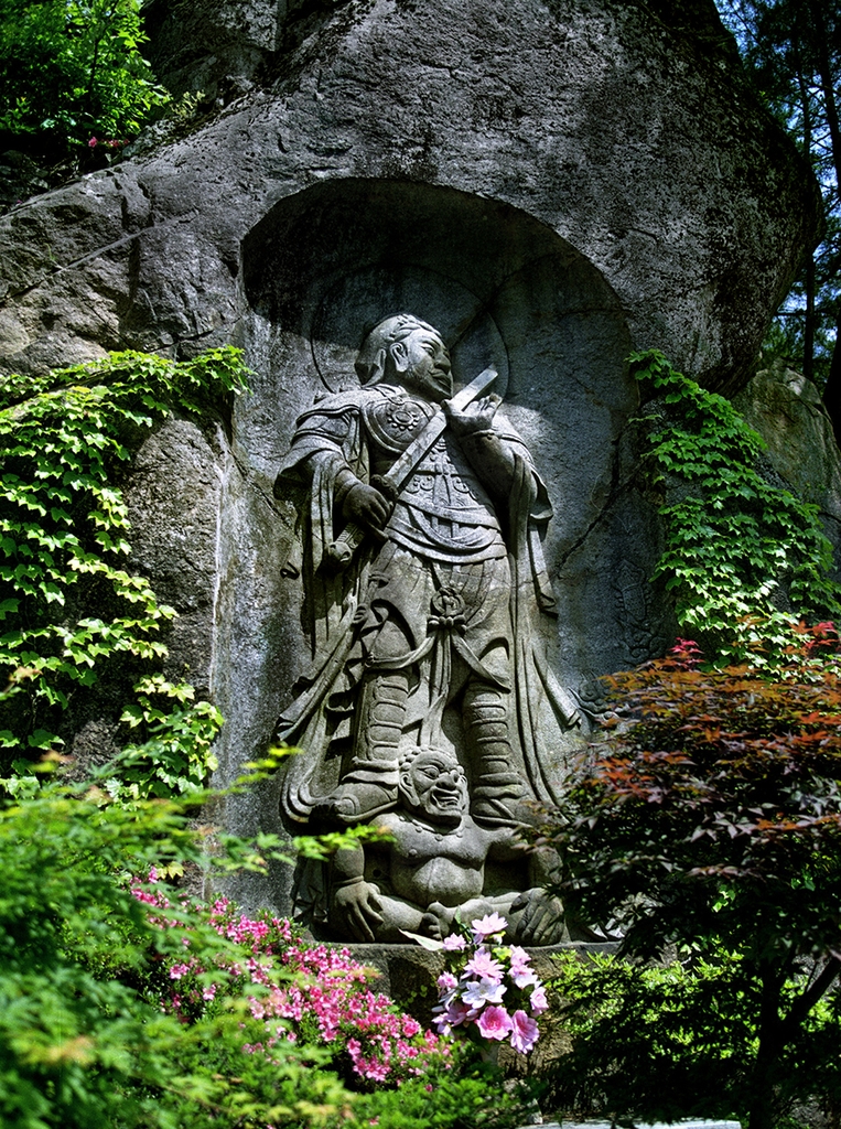 사천왕문도 독특하다. 여느 절 같으면 누각 안에 나무로 조각한 사천왕들이 서 있을 텐데 돌기둥을 지나 돌계단을 오르다 보면 오른쪽 이끼 낀 바위 절벽에 정교하게 조각된 사천왕을 만나게 된다.