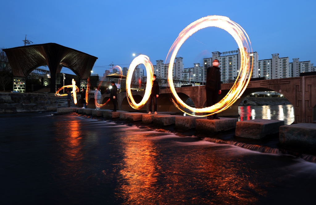 | ▲ 정월대보름을 앞둔 2월 23일 광주천 두물머리에서 주민들과 구청 직원들이 코로나19 극복을 기원하며 쥐불놀이를 하고 있다. [연합뉴스 자료사진] |