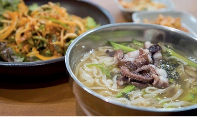 | ▲ 나릿골 '할머니의 부엌' 대표 메뉴인 문어 칼국수와 가자미 무침 [사진/성연재 기자] |