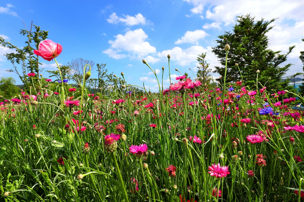 우리를 맞아준 것은 꽃창포 외에도 장미, 백련과 홍련, 수레국화, 꽃양귀비 등이었다. 특히 수레국화와 꽃양귀비는 동화에서나 볼 법한, 화사한 꽃밭을 만들고 있었다.