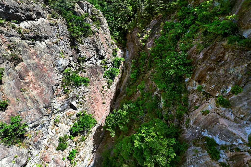 출렁다리에서 밑을 내려다보면 우리나라에 이렇게 좁고 깊은 계곡이 있었나 싶다. 협곡 사이에는 가느다란 폭포가 길게 뻗어 있었다. 폭포 중간과 끝에는 용소, 용담이라는 웅덩이가 형성돼 있다.