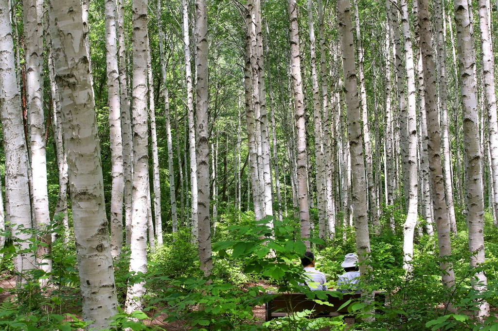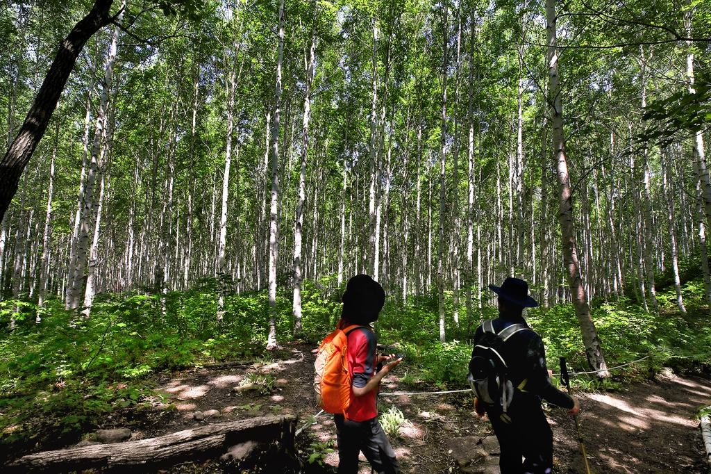 주차장 옆 숲 입구에서 1시간 남짓 완만한 임도를 따라 올라가면 20∼30년생 자작나무 41만 그루가 밀집한 숲을 만난다.