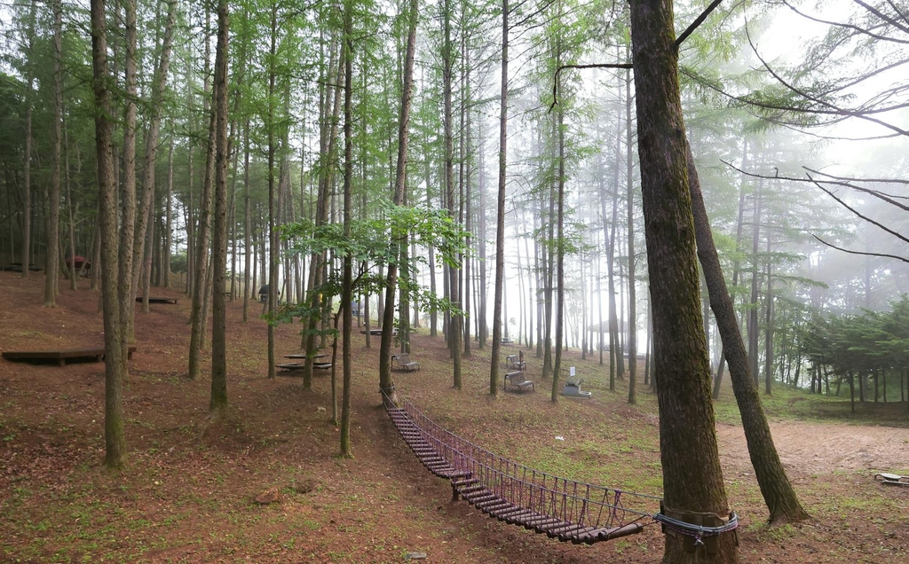 낙엽송이 우거진 숲속에 처마가 있는 벤치와 나무 데크 등이 자리 잡고 있어 한여름에도 서늘함을 느낄 수 있다.