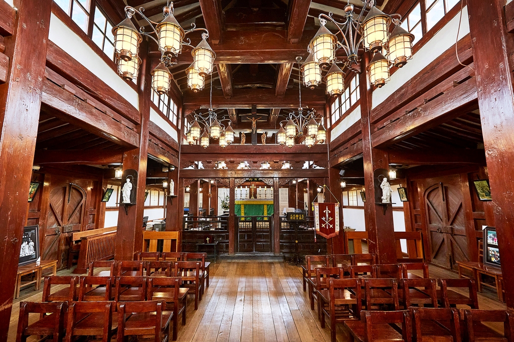 얼핏 보면 사찰처럼 보이기도 하지만, 실은 성당이다. 기와지붕 꼭대기에 달린 십자가가 이 건물의 정체성을 말해준다.