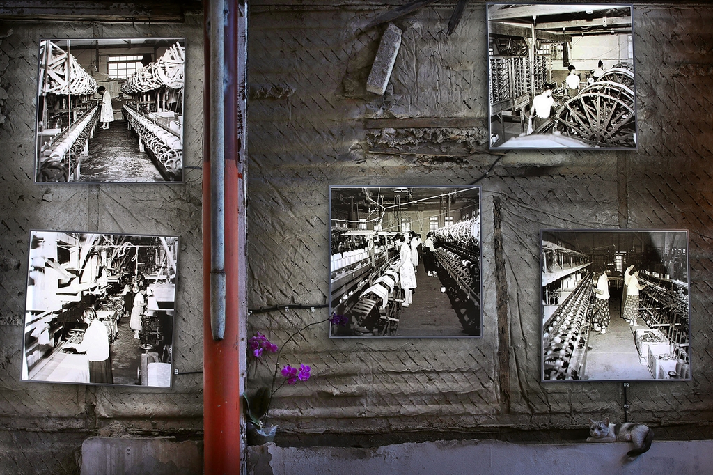이 긴 작업대 앞에서 여공들이 기계를 돌렸던 모습을 카페 한쪽 벽면에 걸린 흑백사진을 통해 볼 수 있다.