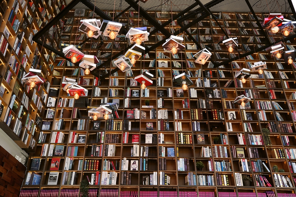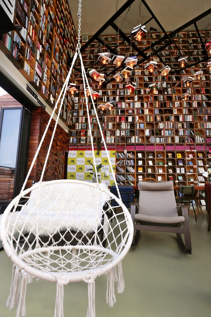 그네와 해먹이 놓인 정원을 지나 책방 안으로 들어서니 3층 높이의 벽면을 가득 채운 책장과 공중에 매달린 조명이 눈길을 끈다.