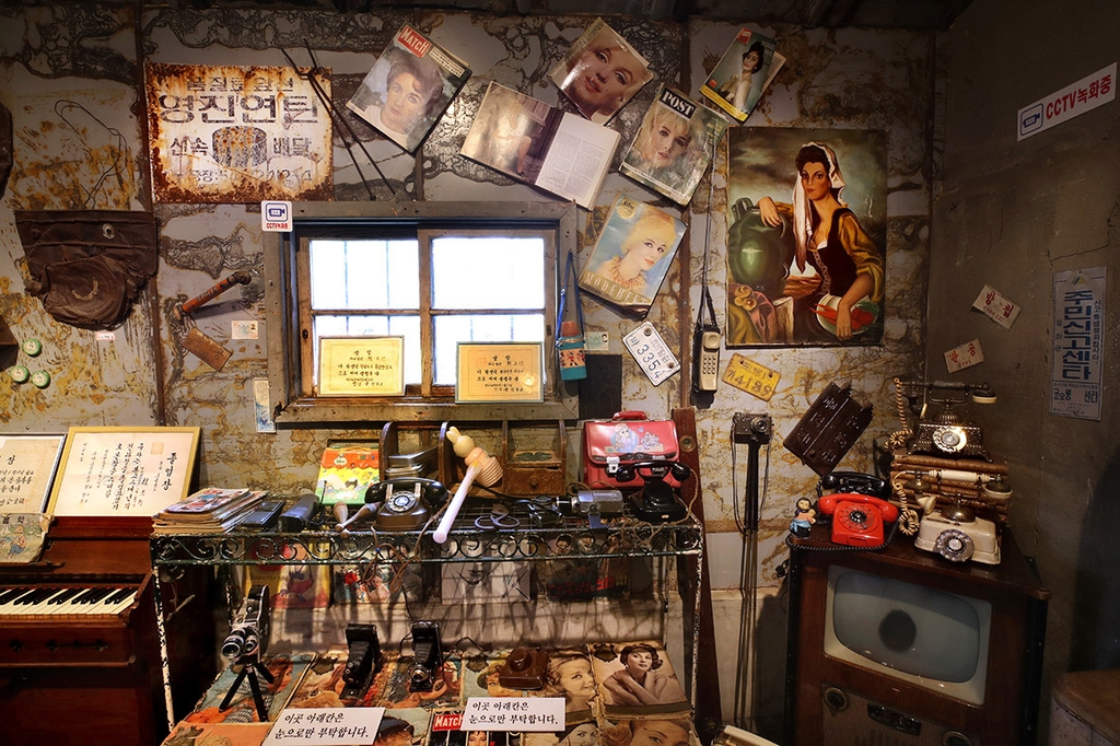 'US ARMY'라고 쓰인 번호판을 단 낡은 버스, 부서져 가는 타자기와 아코디언, 오래된 목마와 낡은 재봉틀, 빛바랜 영화 포스터와 흑백사진…