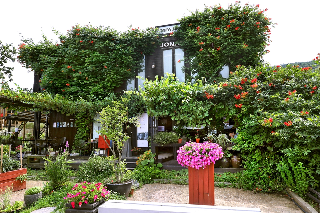 푸른 등나무와 주홍빛 능소화로 둘러싸인 건물 1층에는 35석 규모의 극장이, 2층에는 카페 겸 레스토랑이 자리하고 있다.