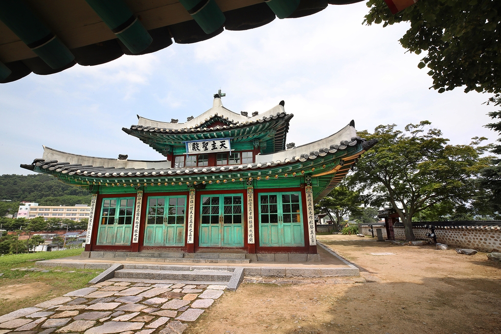 푸른 잔디밭을 사이에 두고 서 있는 전통 한옥 양식의 성당과 서양식 교회가 절묘하게 조화를 이룬다.