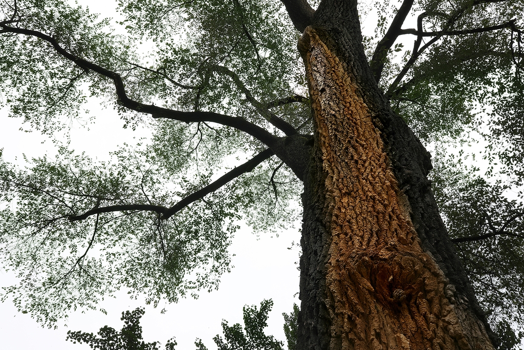 | ▲ 비술나무. 가지가 잘리고 난 상처에서 새어 나온 수액이 흘러내리면서 몸통의 일부가 옅은 갈색으로 변했다.[사진/전수영 기자] |