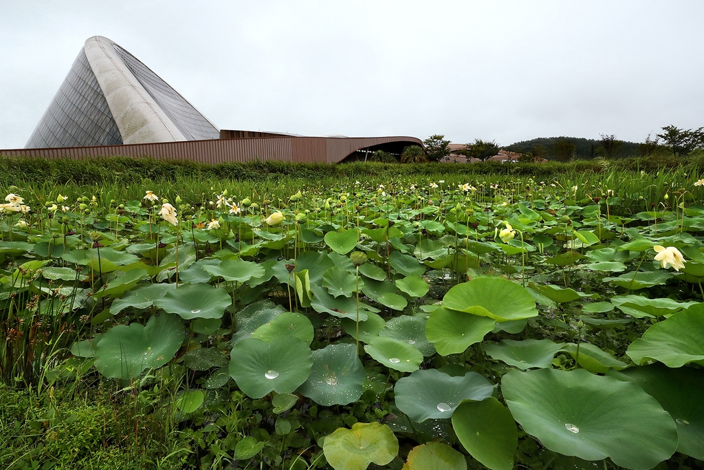 | ▲ 연꽃이 가득한 습지생태원에서 본 에코리움 [사진/조보희 기자] |