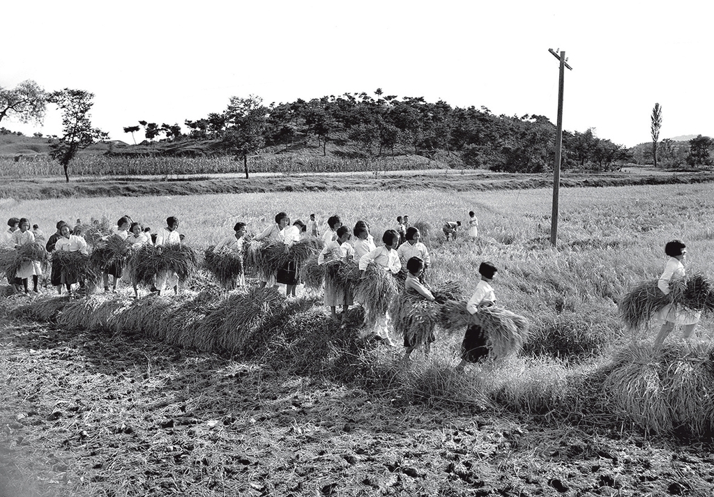 | ▲ 논에서 볏단을 나르는 어린 여학생들. 1954년 [국가기록원 제공] |