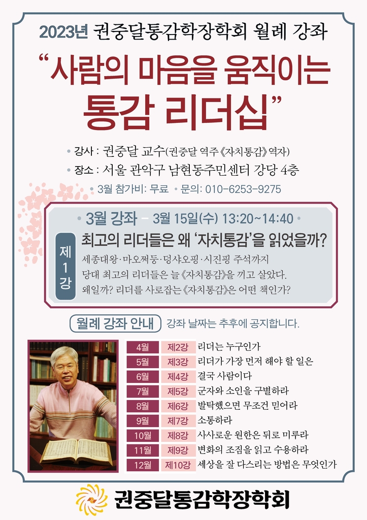 강의는 자치통감을 번역한 권 교수가 직접 맡으며, 이달 15일 서울 관악구 남현동주민센터 4층 강당에서 첫 강의를 시작한다.