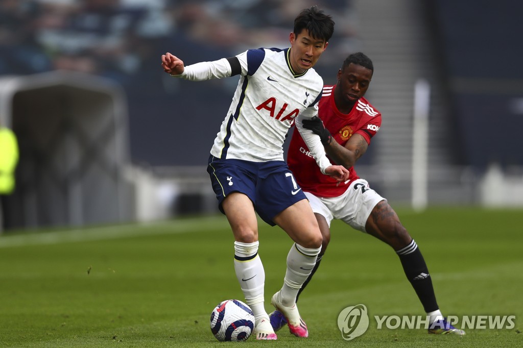 ▲ In this EPA photo, Son Heung-min of Tottenham Hotspur (L) battles Aaron Wan-Bissaka of Manchester United during a Premier League match at Tottenham Hotspur Stadium in London on April 11, 2021. (Yonhap)