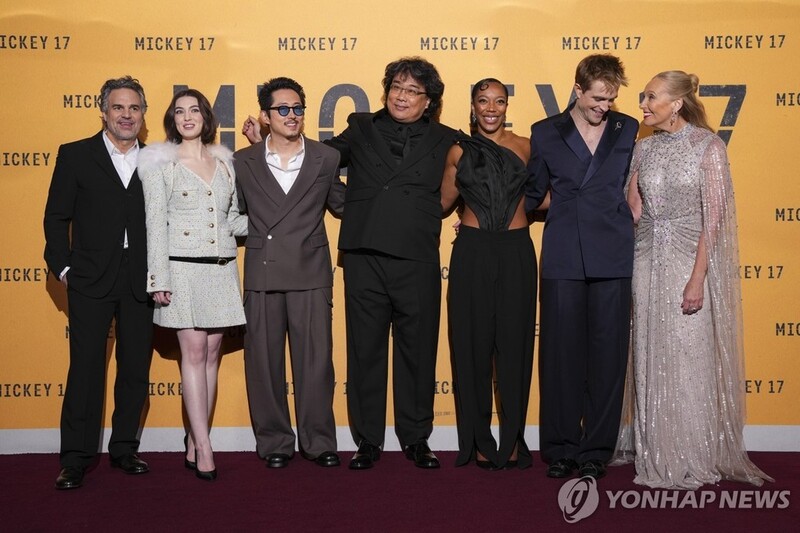 | ▲ 지난 13일(현지시간) 영국 런던에서 '미키 17' 월드 프리미어 참석한 봉준호 감독과 출연 배우들 [런던 AP=연합뉴스. 재판매 및 DB 금지] |