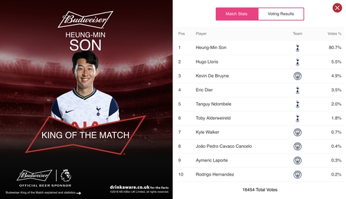 EPL 사무국이 온라인 팬 투표로 뽑는 '킹 오브 더 매치'로는 손흥민이 선정됐다.