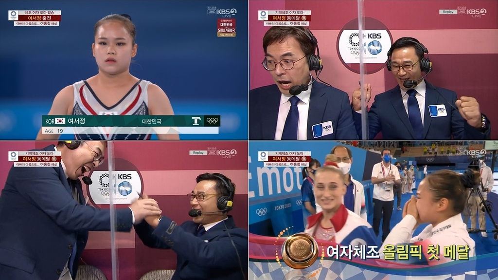 여서정의 동메달이 결정되는 순간 환호하며 캐스터와 손을 맞잡은 그의 모습은 시청자들에게 큰 감동으로 다가왔다.