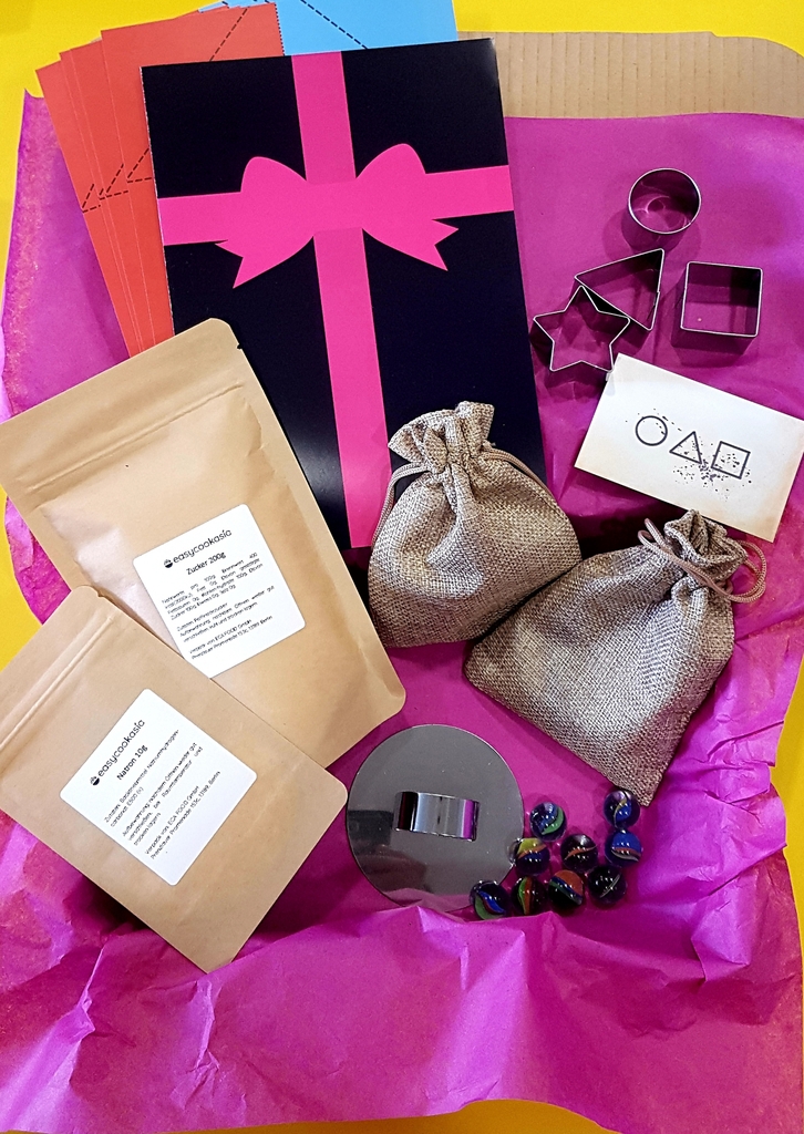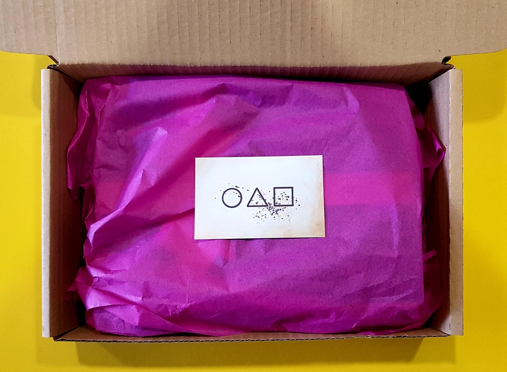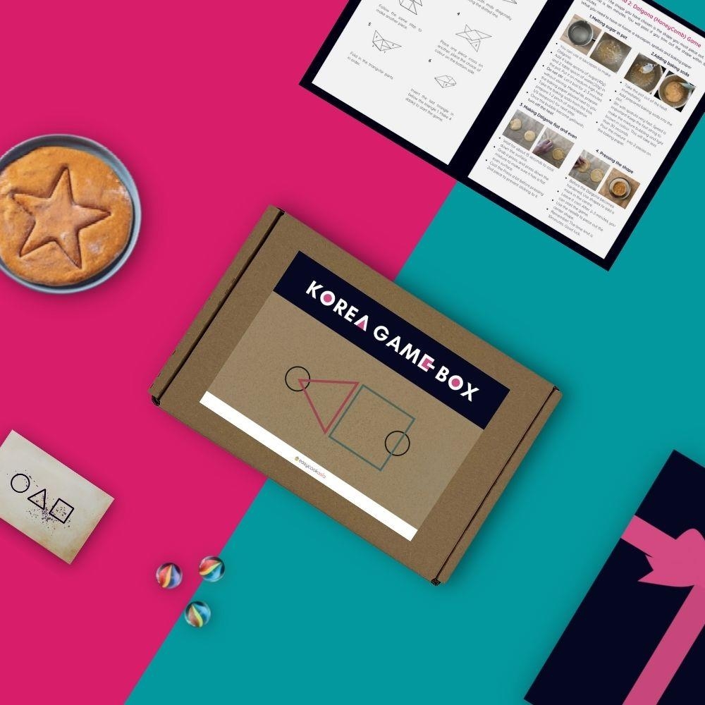 오징어게임 속 리본을 묶은 관처럼 포장된 키트에는 딱지를 접을 수 있는 종이, 달고나를 만들 수 있는 설탕과 소다, 누름판, 모형틀, 바늘과 구슬 20개와 주머니 2개가 들어있다.