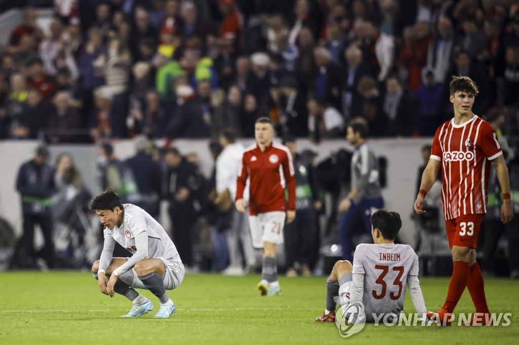 | ▲ 올림피아코스의 유로파리그 조별리그 탈락에 아쉬워 하는 황인범(33번)과 황의조(왼쪽) [EPA=연합뉴스] |