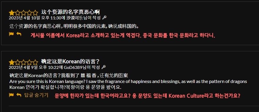그러나 중국에도 이런 사실이 알려지면서 일부 네티즌들은 원색적인 욕설과 함께 "한국 문화는 중국 문화의 일부", "현판과 문양에 한자가 있으니 한국 문화가 아닌 중국 문화" 등의 댓글을 달며 억지 주장을 펼치고 있다.
