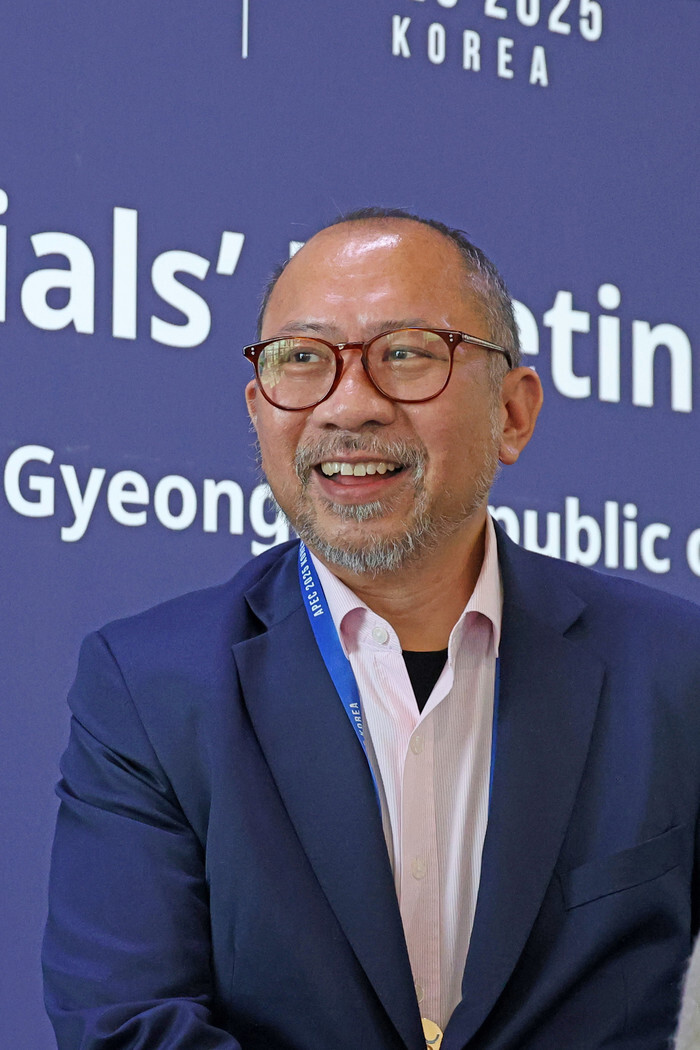 Eduardo Pedrosa, executive director of the Asia-Pacific Economic Cooperation (APEC) Secretariat, speaks during an interview with Yonhap News at the HICO convention center in the southeastern city of Gyeongju on March 9, 2025, after attending the first preparatory meeting of senior officials of the participating countries for this year's summit of the upcoming APEC forum, which will be hosted by South Korea in November. (Yonhap)