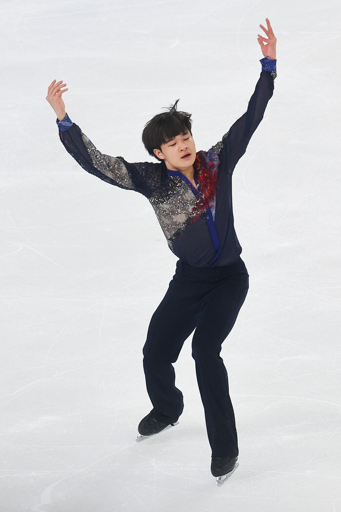 Kim Hyun-gyeom of South Korea performs in the men's singles free program at the Asian Winter Games at Heilongjiang Ice Events Training Center Multifunctional Hall in Harbin, China, on Feb. 11, 2025. (Yonhap)