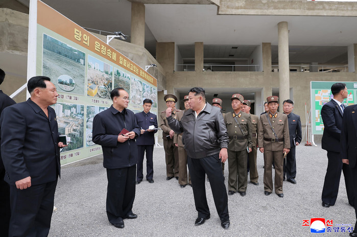 North Korean leader Kim Jong-un (C) inspects the construction site of school supply and teaching tool factories in Pyongyang on Nov. 4, 2025, in this photo released by the North's official Korean Central News Agency the following day. (For Use Only in the Republic of Korea. No Redistribution) (Yonhap)