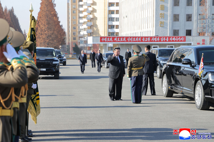 North Korean leader Kim Jong-un (C) receives a salute from an officer as he visits the public security ministry in Pyongyang on Nov, 18, 2025, on the occasion of the 80th founding anniversary of the public security organ, in this photo released by the North's official Korean Central News Agency the next day. (For Use Only in the Republic of Korea. No Redistribution) (Yonhap)