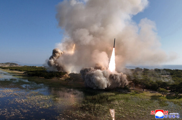 This photo, released by North Korea's official Korean Central News Agency on May 9, 2025, shows the North Korean army conducting a joint strike drill involving long-range artillery and a new variant of tactical ballistic missiles on the eastern front the previous day. The North's leader Kim Jong-un oversaw the drill involving a 600-millimeter multilayer rocket system and the Hwasongpho-11-Ka tactical ballistic missile, and emphasized the combat readiness of the country's nuclear forces, the report said. (For Use Only in the Republic of Korea. No Redistribution) (Yonhap)
