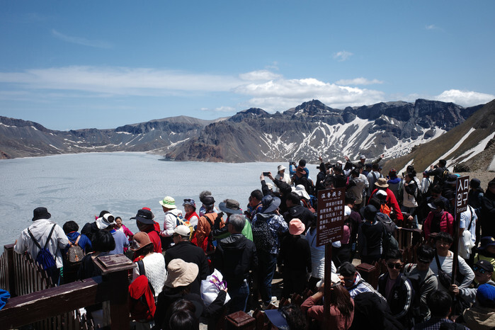 Tourists view Chonji, the crater lake seen from the west slope of Mount Paekdu, located on the North Korean-Chinese border, on June 12, 2025. (Pool photo) (Yonhap)