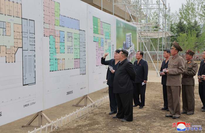 North Korean leader Kim Jong-un (C, front) inspects the construction site for a hospital and a general service center in Kangdong County, Pyongyang, on June 2, 2025, in this photo released by the North's official Korean Central News Agency the next day. (For Use Only in the Republic of Korea. No Redistribution) (Yonhap)